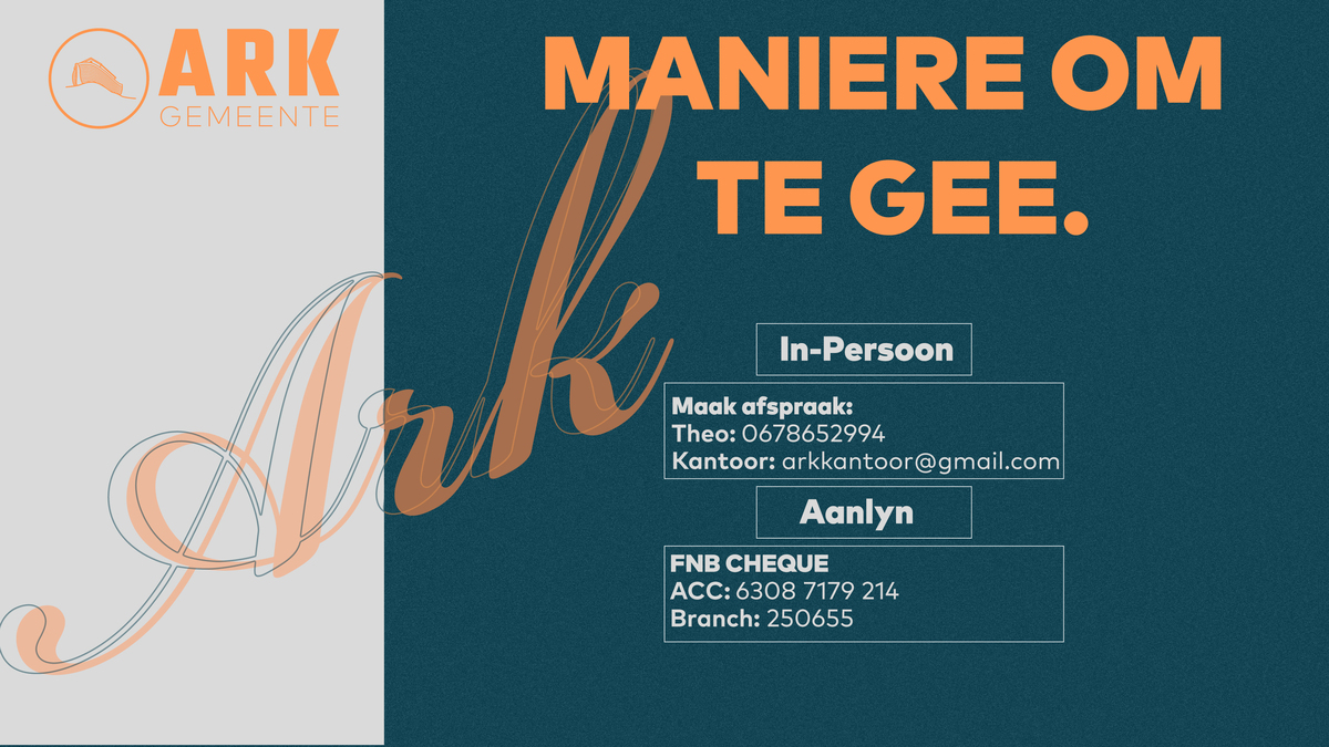 Indien jy op jou hart voel om 'n donasie te maak, gebruik die "Maniere om te gee". Elke bydrae help om die begin van die gemeente moontlik te maak.